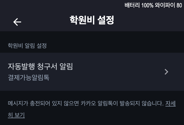 가지 않게 하거나 다른형태 알림톡으로 변경하는 것은 모바일 - 더보기 - 원설정- 학원비 설정에서 설정해주세요!