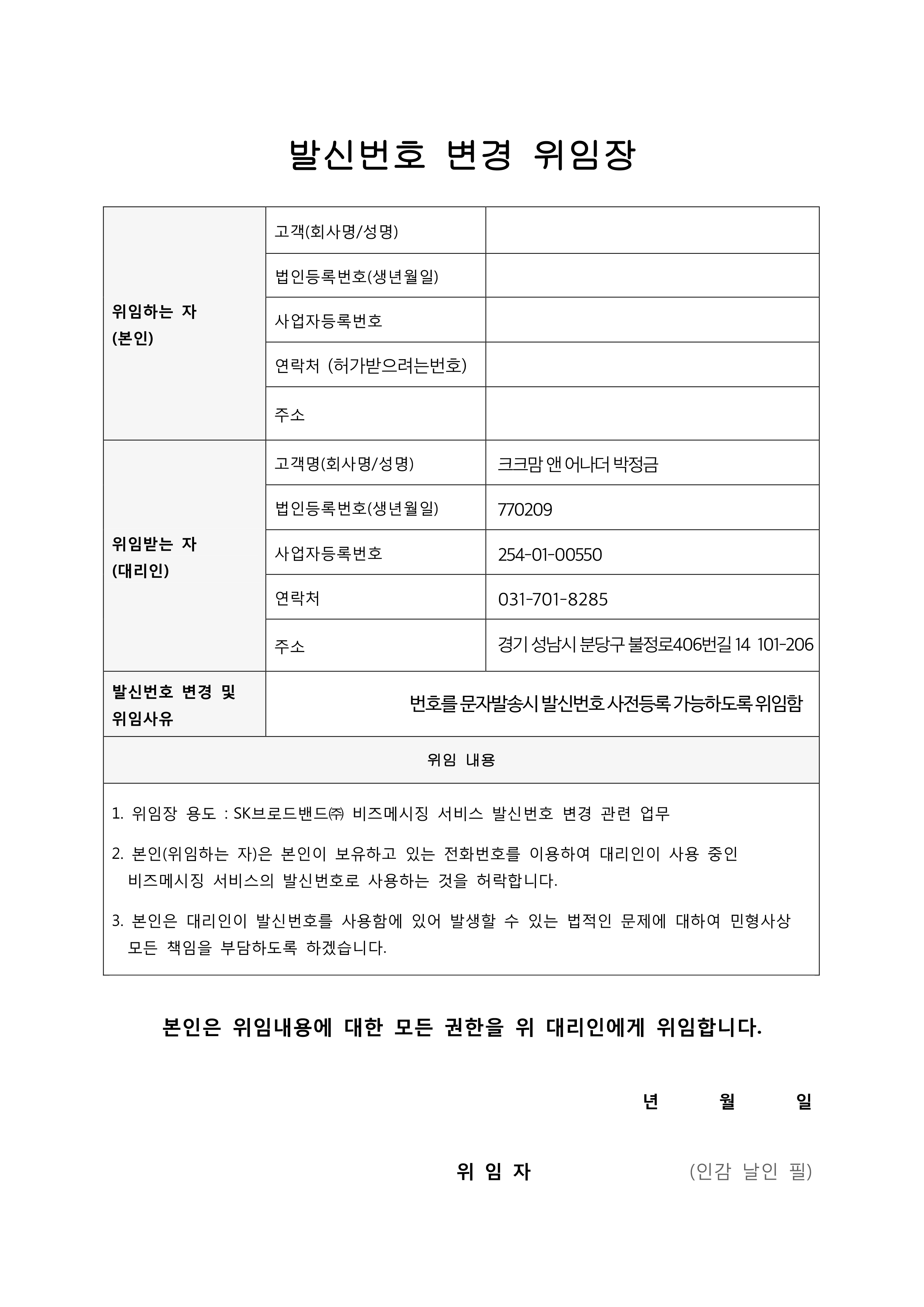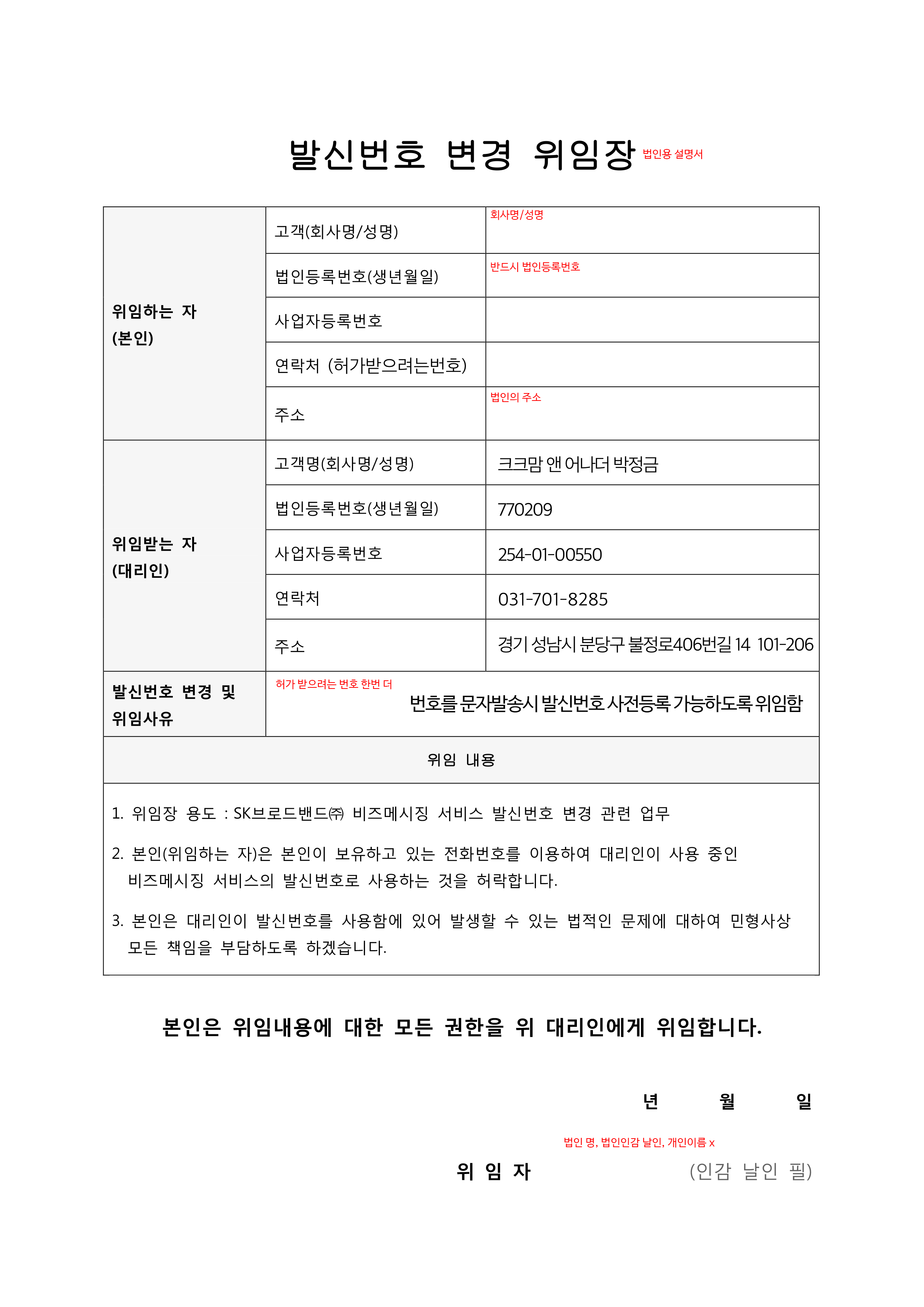 - 아래 양식의 문자발송 계약서에 서명(법인은 날인)해서 1부