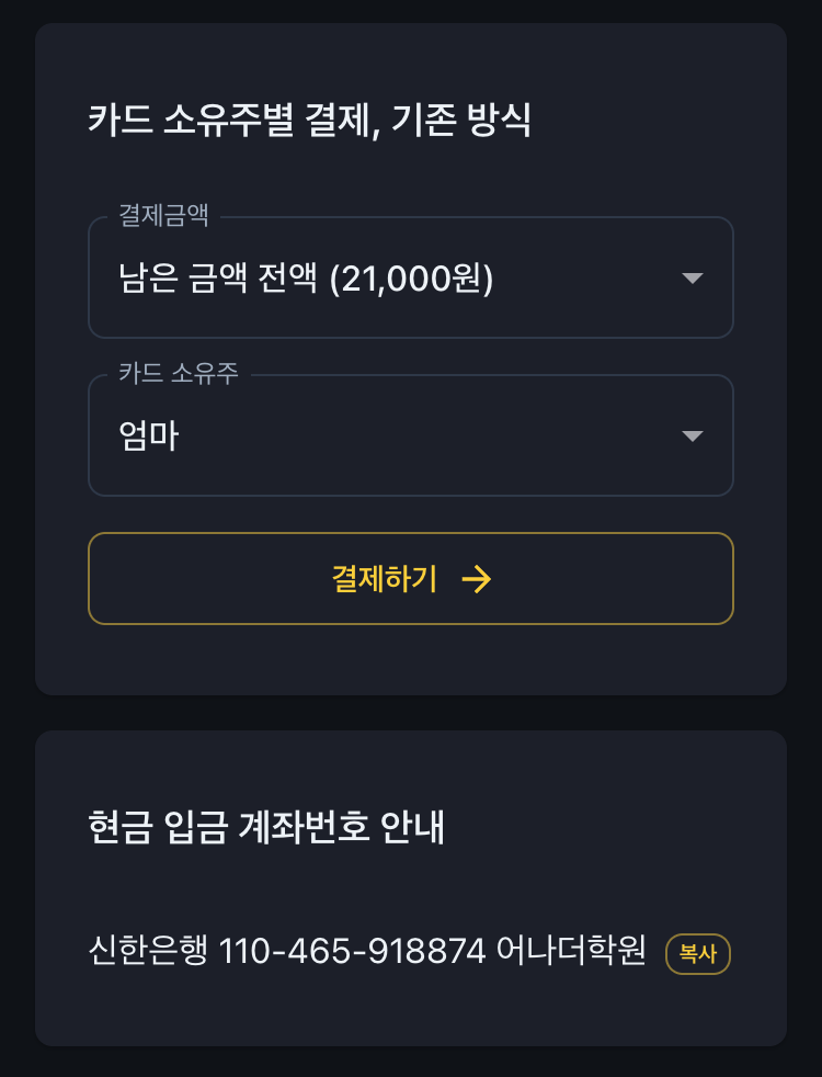 기존에 편했던 여러 카드 소유주 결제도 당연히 계속 지원합니다. 현금 입금 계좌번호는 보기 좋게 별도로 분리하였습니다.