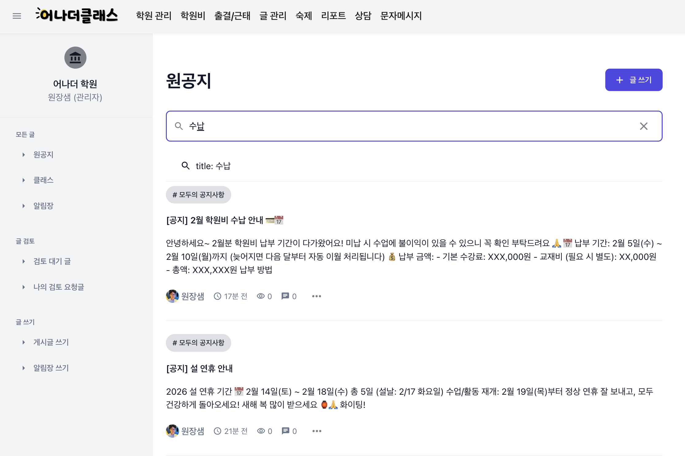 안녕하세요. 알림장에서만 되던 검색 기능이 일반게시판 (원공지 / 클래스) 에서도 가능하게 업데이트 되었습니다.