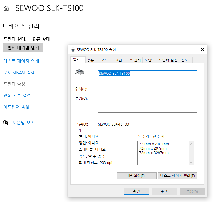 설정에서 프린터라고 검색 혹은 장치에서 프린터 메뉴로 들어가주세요. 여기서 TS100을 클릭하고 관리를 눌러주세요.