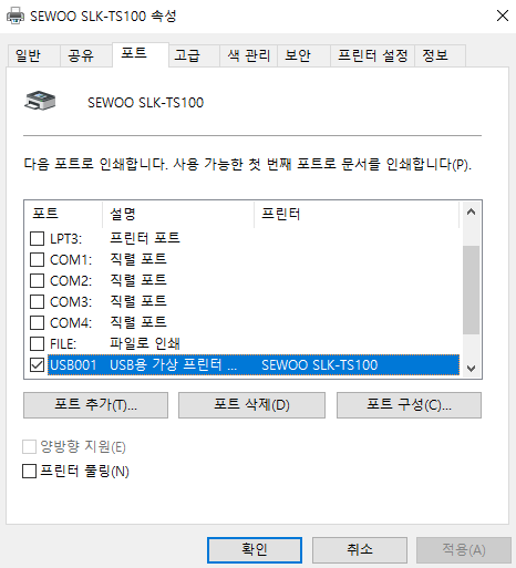 여기가 가장 중요합니다. 포트가 USB로 선택되어 있는지 확인해 주세요.